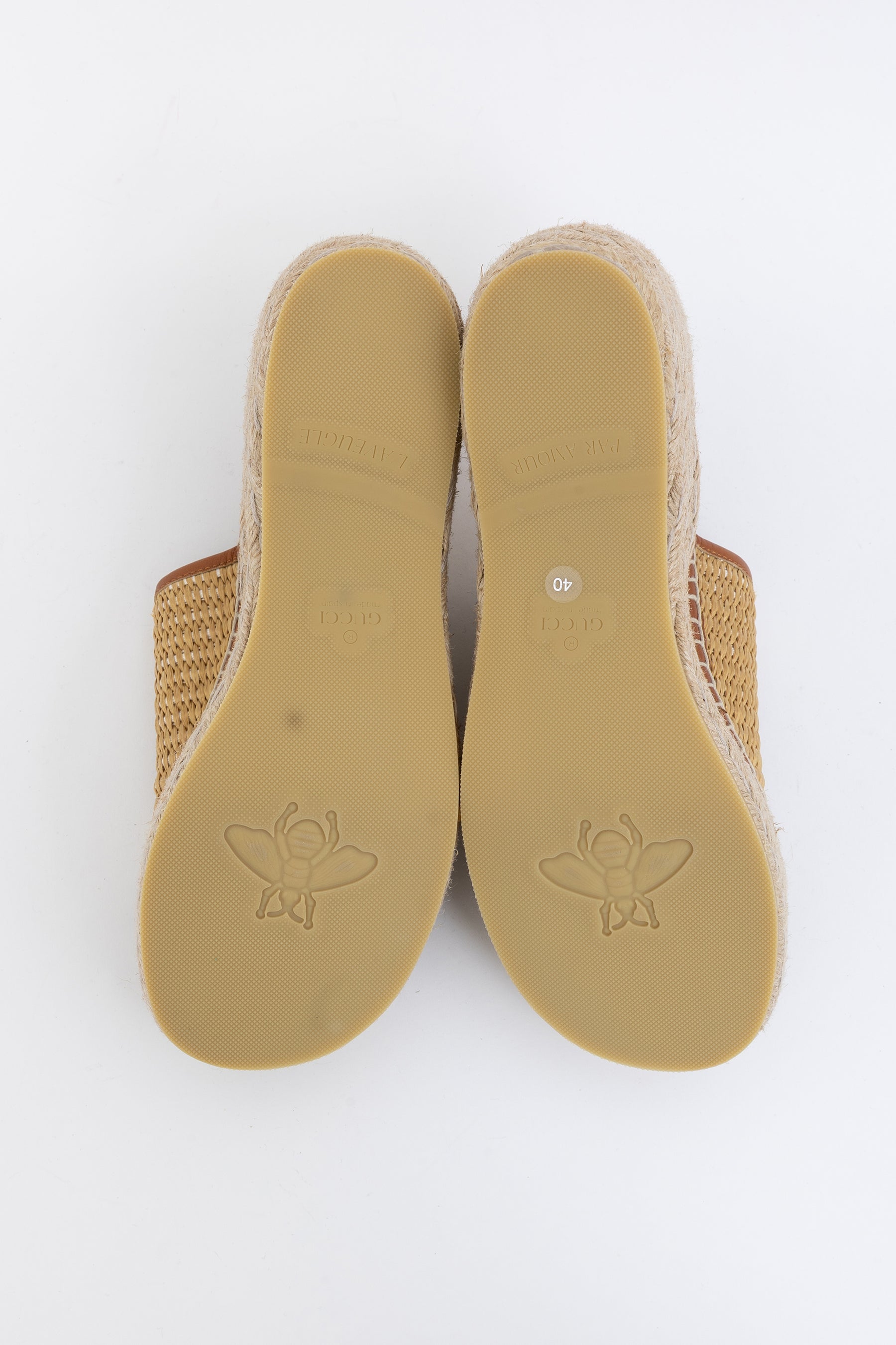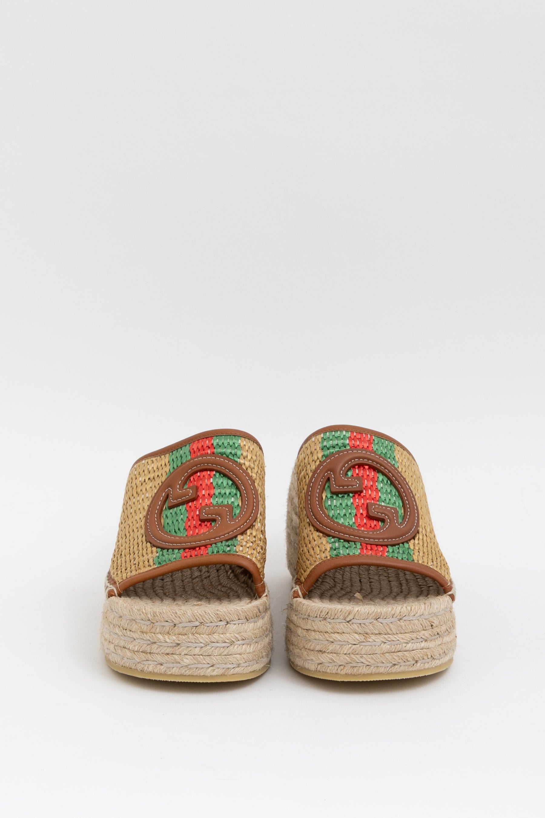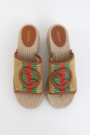 These stylish shoes are crafted of raffia with a leather interlocking GG logo on the vamp and jute espadrille platforms.